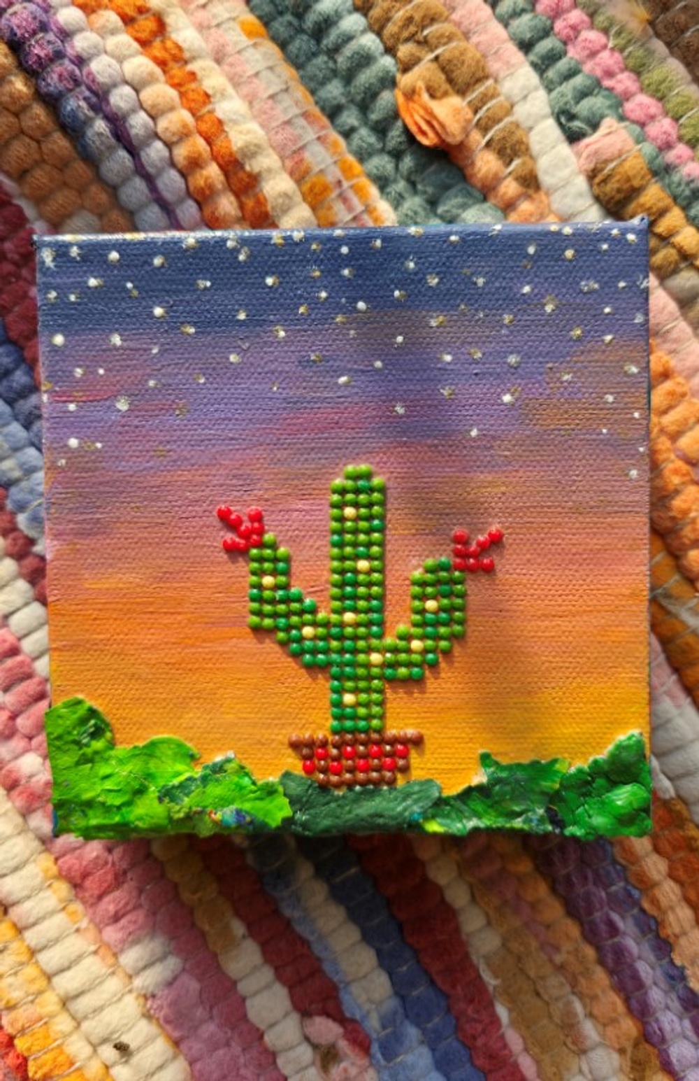 Gems and dried paint give this artwork a nice texture that looks beautiful against the perfectly blended sunset sky. This mixed media artwork was donated to the Edmond Arts 5"x5" fundraiser show.